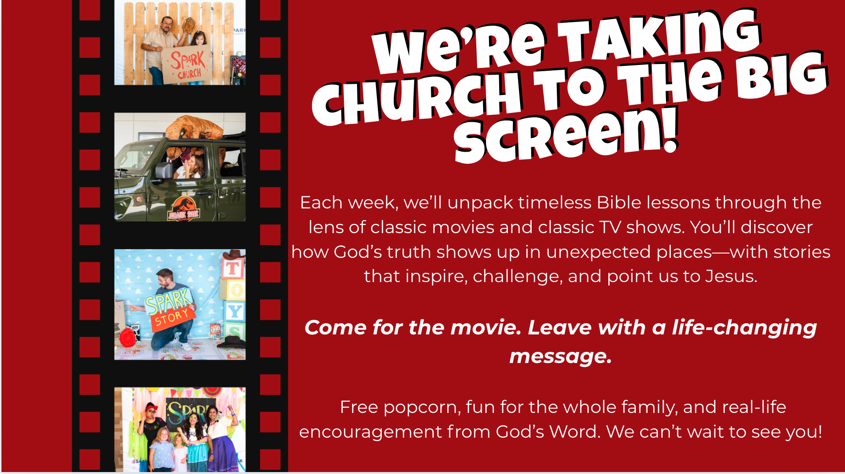 Each week while you enjoy the service, they will spend time in worship, enjoy snacks, and learn about God’s love from an At the Movies message created specifically for them.